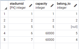 体育场桌子上有体育场的数量、容量和拥有它的球队。