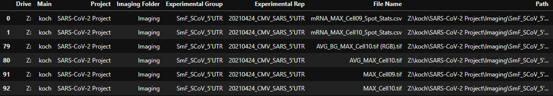 驱动器主要项目成像文件夹实验组\>0 Z: koch SARS-CoV-2项目成像SmF_SCoV_5'UTR >1 Z: koch SARS-CoV-2项目成像SmF_SCoV_5'UTR > 79 Z: koch SARS-CoV-2项目成像SmF_SCoV_5'UTR > 80 Z: koch SARS-CoV-2项目成像SmF_SCoV_5'UTR > 91 Z: koch非典-CoV-2项目成像SmF_SCoV_5'UTR > 92 Z: koch SARS-CoV-2项目成像SmF_SCoV_5'UTR >实验Rep文件名\0 20210424_CMV_SARS_5'UTR 1> 20210424_CMV_SARS_5'UTR mRNA_MAX_Cell10_Spot_Stats.csv 79 > 20210424_CMV_SARS_5'UTR AVG_BG_MAX_Cell10.tif 80 > 20210424_CMV_SARS_5'UTR AVG_MAX_Cell10.tif 91 > 20210424_CMV_SARS_5'UTR MAX_Cell09.tif 92 > 20210424_CMV_SARS_5'UTR MAX_Cell10。tif >>路径7 0 Z:\koch\SARS-CoV-2项目\成像\SmF_SCoV_5‘.NaN 1> Z:\koch\SARS-CoV-2项目\成像\SmF_SCoV_5‘.NaN 79 > Z:\koch\SARS-CoV-2项目\成像\SmF_SCoV_5‘.公司名称:0 0 0> Z:\koch\SARS-CoV-2项目\成像\SmF_SCoV_5‘.公司名称:0 91 > Z:\koch\SARS-CoV-2项目\成像\SmF_SCoV_5‘.公司名称:0 92 > Z:\koch\SARS-CoV-2项目\成像\SmF_SCoV_5‘.None