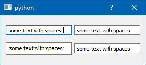 您看不到空格字符,这对于尾随空格来说尤其明显。我知道您可以通过在一个ShowTabsAndSpaces小部件的文档上调用方法setDefaultTextOption来设置选项setDefaultTextOption,但是有什么方法可以在QLineEdit小部件上设置这个选项(或类似的选项)吗?