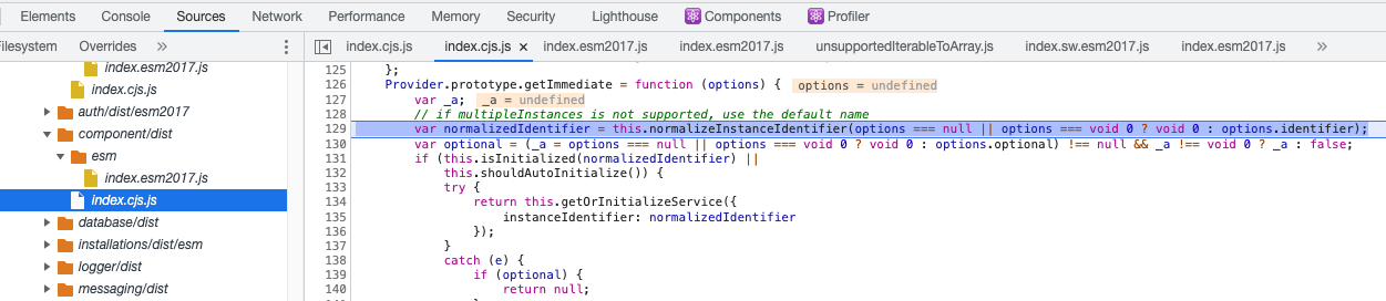 在这里,第1155行:实际上转到firebase/app lib es2017文件来解析提供程序,然后返回到第1155行,然后调用getImmediate,最后在组件库中的通用索引文件中结束,如下所示: