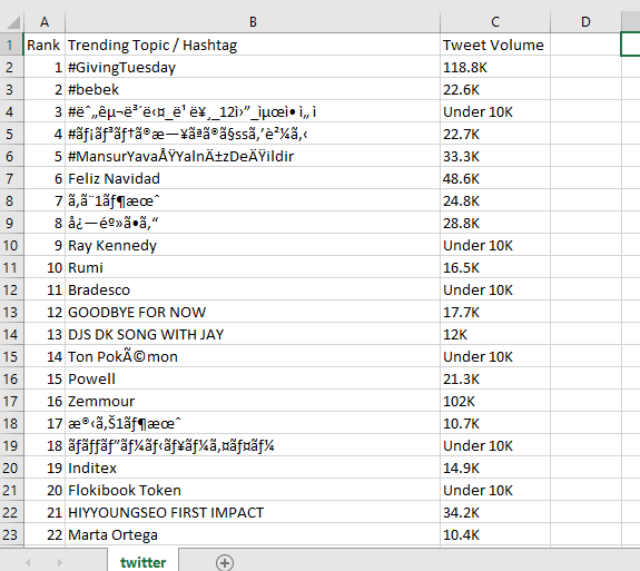 要刮掉推特趋势-全球表,可以使用Pandas中的DataFrame并使用下面的定位器策略将其写入csv文件