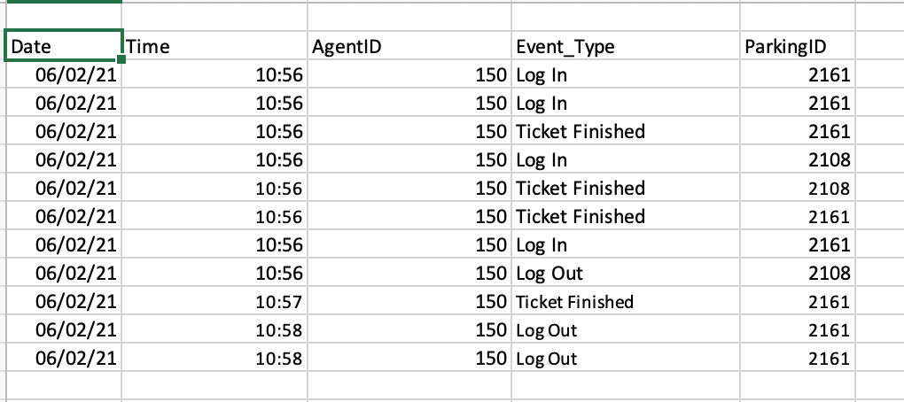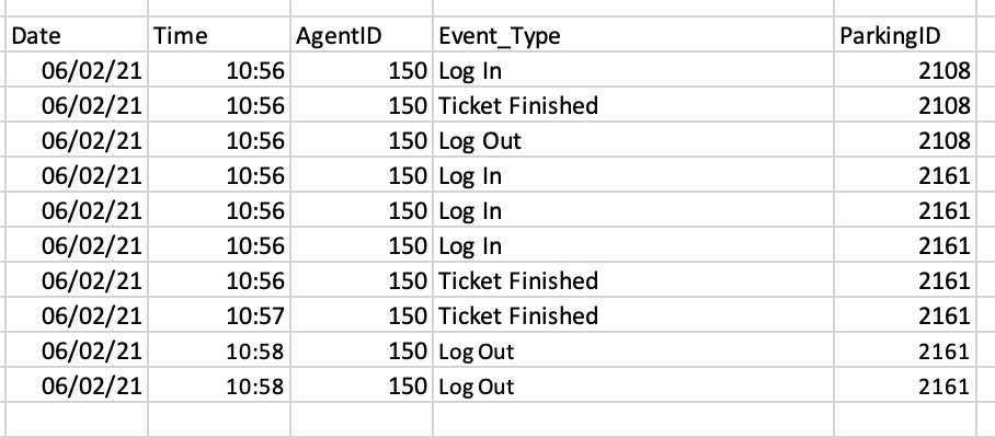 我正在做一个个人项目,我被困在清理特定数据集的阶段。数据集由访问不同停车站点(具有唯一AgentID)的代理(具有唯一ParkingID)的记录组成。他正在使用一个应用程序在数据库中输入他的记录。当代理进入停车场时,他按下登录按钮,离开时在应用程序中按注销(代理可以多次按该按钮,因此有可能重复登录和注销记录)。当他/她访问一个停车场时,他/她可以在那个地方遇到某些人时拿出一些罚单,从而在应用程序中标记Tickets Finished。问题是进入数据库的数据只被排序到分钟阶段。因此,具有相同时间的记录可以在数据库中以不同的方式出现。下面显示了这样一个虚拟数据集。