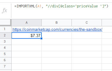 公式:=IMPORTXML(“"/html/body/div1/div1/div/div2/div/div1/div2/div/div2/div1/div/span",,https://coinmarketcap.com/currencies/the-sandbox/" "en US)