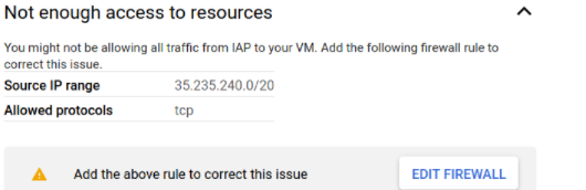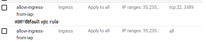 问题是,当我在默认VPC中为防火墙配置"all“时,对于默认VPC外部的VM的警告也会消失。IAP防火墙规则是跨项目应用的,我不这么认为。我也在其他VPC中配置了允许从IAP进入防火墙规则,但是它只有22和3389端口,所以理想情况下IAP应该为它们显示警告。
