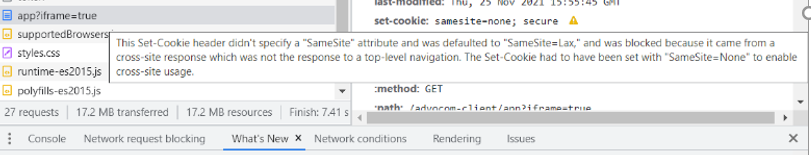 之后,我尝试在响应头中设置条目" set -cookie: samesite=none;secure",但没有成功。正如您在下面的屏幕截图中所看到的,浏览器仍然使用“同一个站点=lax”。