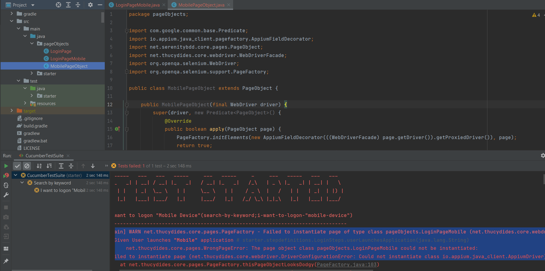 [main] WARN net.thucydides.core.pages.PageFactory - Failed to instantiate page of type class pageObjects.LoginPageMobile (net.thucydides.core.webdriver.DriverConfigurationError: Could not instantiate class io.appium.java_client.AppiumDriver)