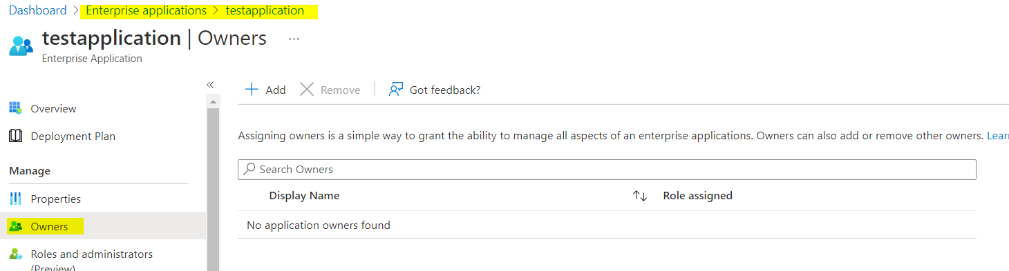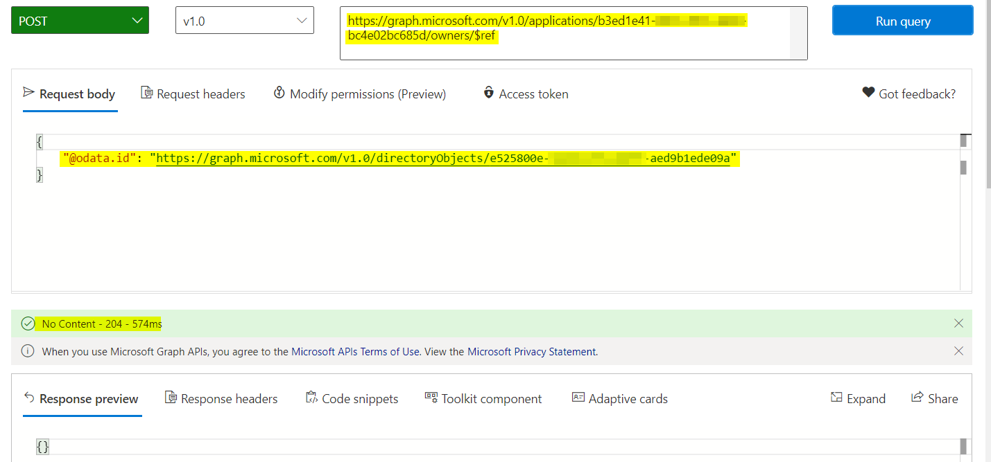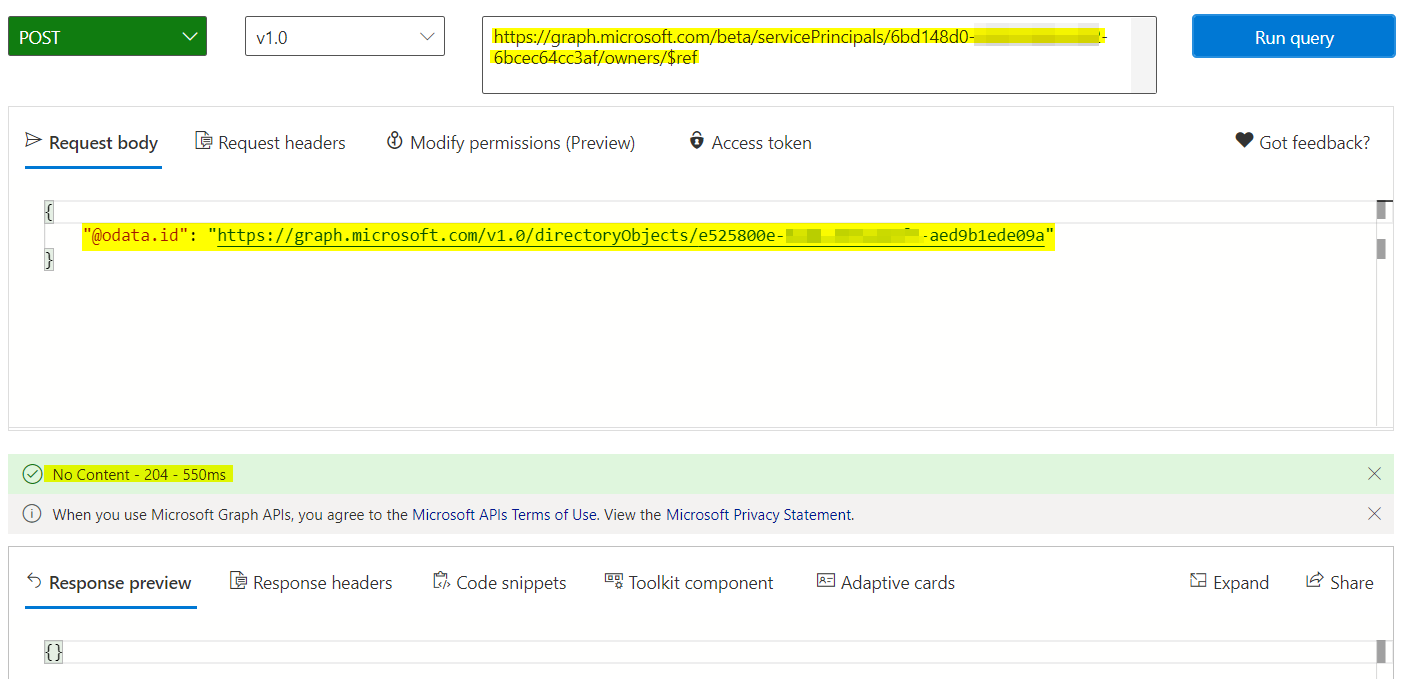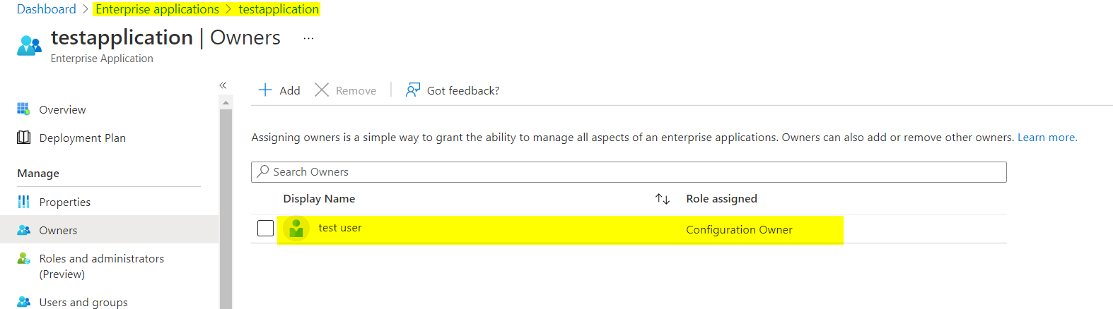我尝试使用图形API分配企业应用程序所有者,输出显示成功。不幸的是,在GUI中,我的用户仍然不是那个应用程序的所有者。