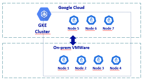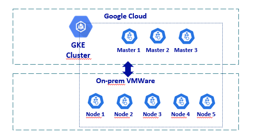 对于上述解决方案,主节点是由GCloud管理的,但理想的解决方案是管理多节点主程序(高可用性)云上的和prem上的节点。图形示例: