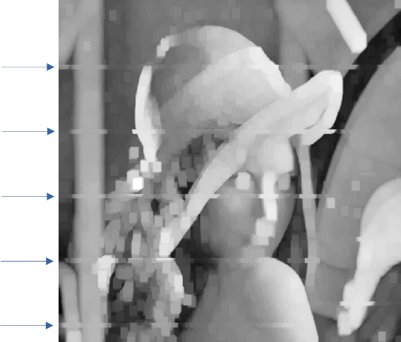 我使用了一个11x15结构功能,共享缓冲区的大小是(nbThreadsPerBlock+2*paddindX) * (nbThreadsPerBlock+2*paddindY)。错误的结果(由箭头显示)出现在某些块的顶部,但总是位于相同的位置和相同的值。我希望记忆竞赛的结果会更随机.