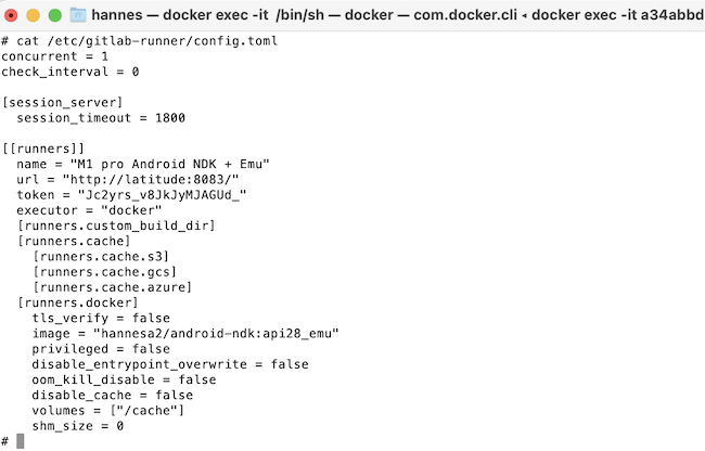 你用-v /srv/gitlab-runner/config:/etc/gitlab-runner开始跑步。但是注册对卷(-v /Users/Shared/gitlab-runner/config:/etc/gitlab-runner)使用不同的路径。