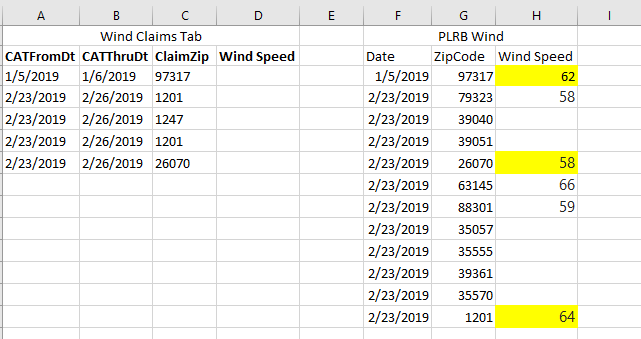 我的目标是将风速从PLRB风力选项卡获取到风力声明选项卡,如果来自PLRB风力选项卡的日期介于风力声明选项卡上的StartDate和EndDate之间,而来自PLRB风力选项卡的Zip代码与风索赔选项卡上的Zip代码匹配。关键是要确定报告破坏的风速。