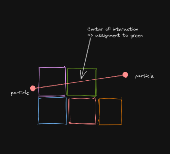 然后,在检查步骤1和步骤2中的相互作用时,根据它们相互作用中心的坐标将粒子相互作用分配给这些新的立方体。每个立方体指定一个瓷砖,并在瓷砖中标记分配给该立方体的相互作用粒子。可视化: