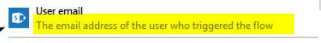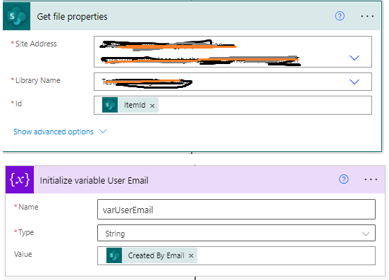 这是所需的额外步骤,添加一个“获取文件属性”,然后允许您使用“由电子邮件创建”属性。下面它存储在一个名为varUserEmail的变量中: