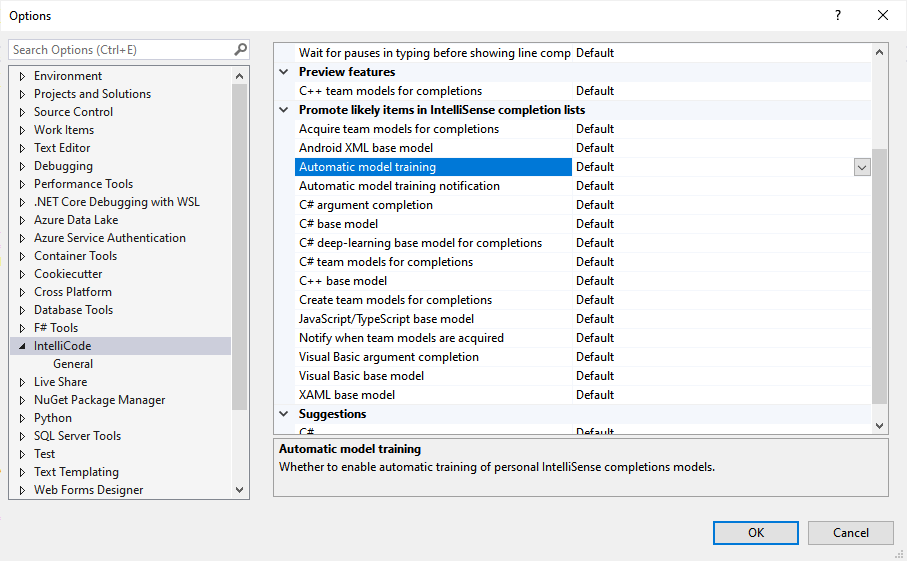 因此,我进入了Tools > Options > IntelliCode > General来转换新功能。我仍然想让IntelliCode像它在VS2019中一样工作,但是我想关掉(理论上)减慢我的编辑体验的新的AI驱动模型。当查看设置时,还不清楚要更改哪些设置。更糟糕的是,甚至不清楚何时启用或禁用。他们都展示了Default。