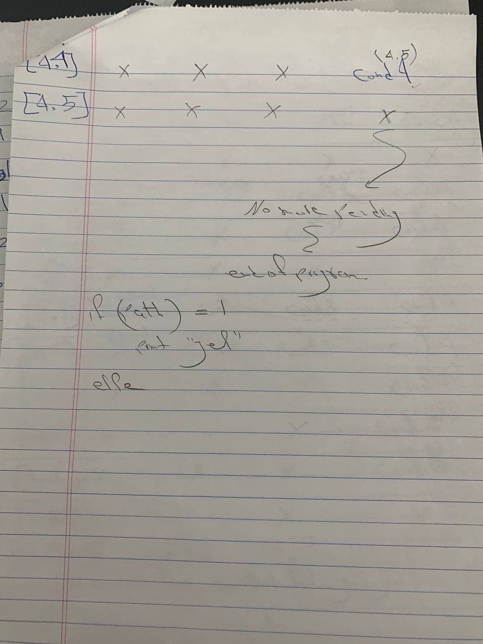 您的程序应该将5个值写入标准输出: Lr Lc Hr Hc YESNO其中Lr Lc是网格中最低点的行和列,Hr Hc是网格中最高点的行和列,YESNO是单词:如果有一条从最低点到最高点的路径永不下降,如果没有这样的路径,则为no。具体来说,路径从最低点开始,只能从一个点到它的四个相邻点(左、右、上、下)中的一个,这些邻居的海拔不低于这个点。输入就会有一个独特的解决方案。