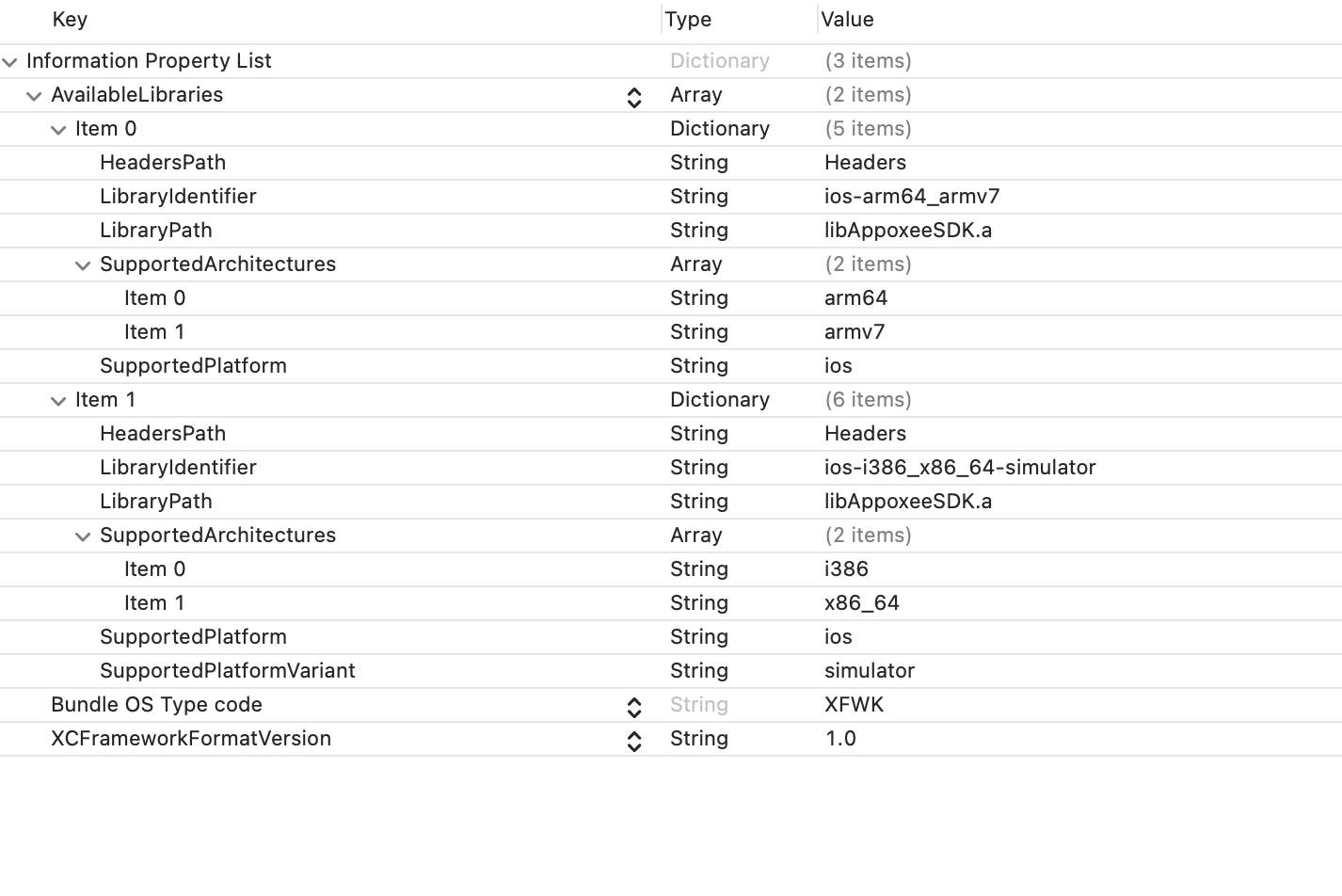 -output ${HOME}/Desktop/${FRAMEWORK_NAME}_${APPOXEE_SDK_VERSION}/SDK/${FRAMEWORK_NAME}.xcframework这就可以创建xcframework了。在xcframework内部有info.plist