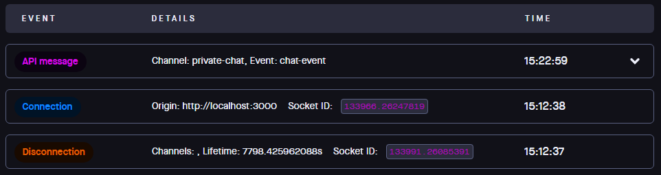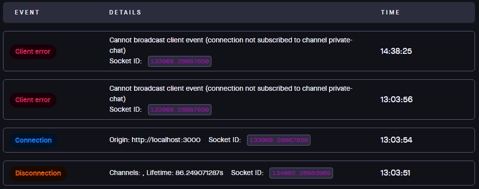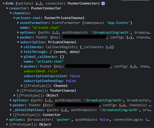 我正在用 Laravel 和 Nuxt (前端和后端分离)构建一个实时聊天应用程序,使用 Pusher 和Laravel-Echo,我已经用pusher配置了Laravel,它可以很好地工作,并且可以在Pusher调试控制台中看到我的请求,我还想提到两件事:我使用Laravel-JWTE 29和E 110Nuxt-AuthE 211进行身份验证;第二,它在公共通道上工作,但是自从我将它转换为E 112私有E 213,it客户端代码E114>可以不再订阅代码<<215>代码>。