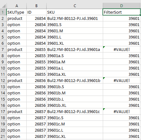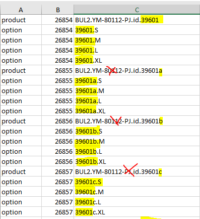 我们需要的方式显示在下面的图片,其中的其他基础SKU,那些与顺序字母被删除,我们留下了原来的基础SKU和所有的子变体。有几件事要注意,"id“后面的数字总是5个数字,变体子SKU的数目不同--例如,一些可以有2个大小,有些可以有6个。另外,附加基SKU的数量也各不相同,例如,有些可以转到"a",另一些可以转到"e“。