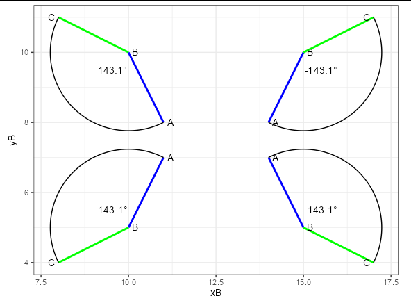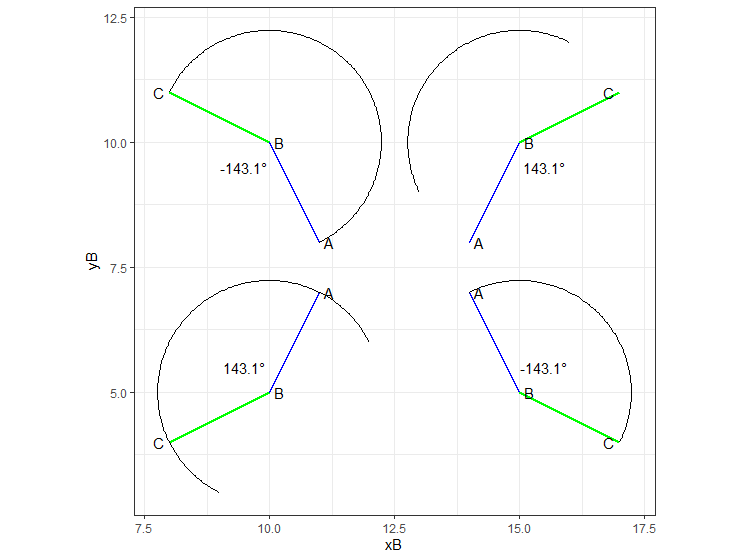 geom_arc(aes(x0 = xB, y0 = yB, r = dAB, start = arcAB, end = arcBC)) + # plus or minus 2*pi