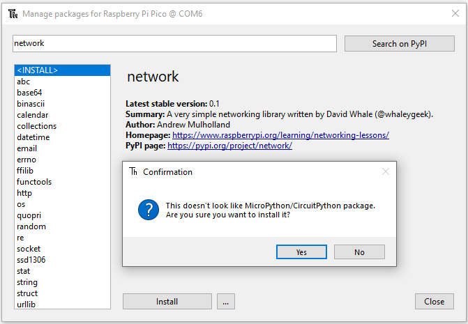 我用Thonny作为编辑,试图搜索他们的包,寻找一个叫做“网络”的东西,并找到了一个匹配的。但这给了我以下的错误/警告。