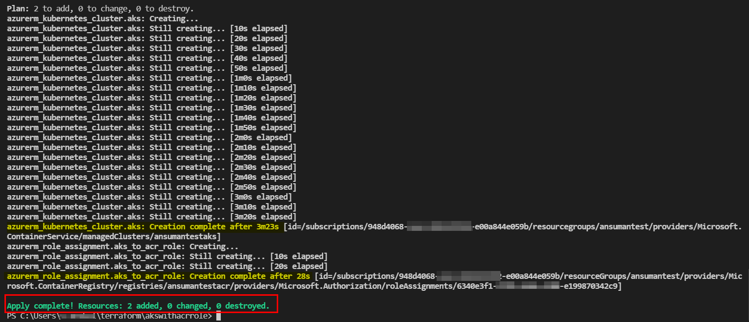 kubelet_identity块,它将自动得到预配置,您可以成功地使用azurerm_kubernetes_cluster.aks.kubelet_identity[0].object_id。因此,代码如下所示:提供程序“azurerm”{ features{} data "azurerm_resource_group“"rg”{ name = "ansumantest“}资源"azurerm_kubernetes_cluster”"aks“{ name = "ansumantestaks”location = data.azurerm_resource_group.rg.location resource_group_name = data.azurerm_resource_group.rg.name dns_prefix= "ansumantestaks-dns“default_node_pool { name = "system”node_count =1 vm_size = "Standard_B2ms“type = "VirtualMachineScaleSets”availability_zones = 1,2,3 enable_auto_scaling = false }标识{ type = "SystemAssigned“}}数据"azurerm_container_registry”"acr_name“{ name = "ansumantestacr”resource_group_name = data.azurerm_resource_group.rg.name } resource "azurerm_role_assignment“"aks_to_acr_role”{ scope= azurerm_kubernetes_cluster.aks.kubelet_identity.object_id role_definition_name = "AcrPull“principal_id =AcrPull skip_service_principal_aad_check = true }