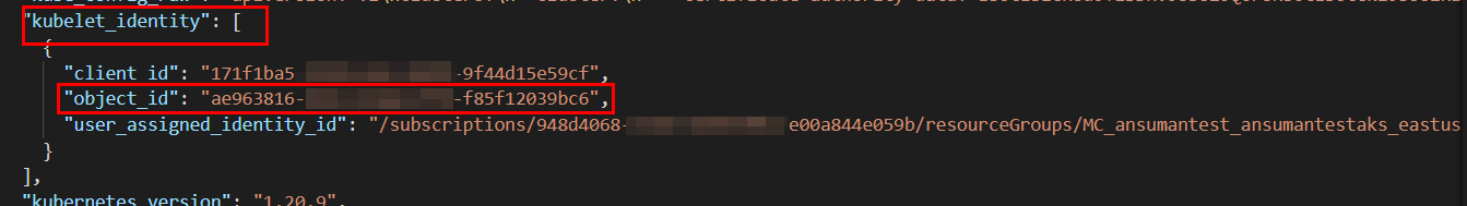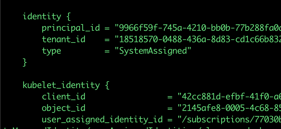 }所以我意识到我只需要改变azurerm_kubernetes_cluster.aks.kubelet_identity[0].object_id的这个部分。