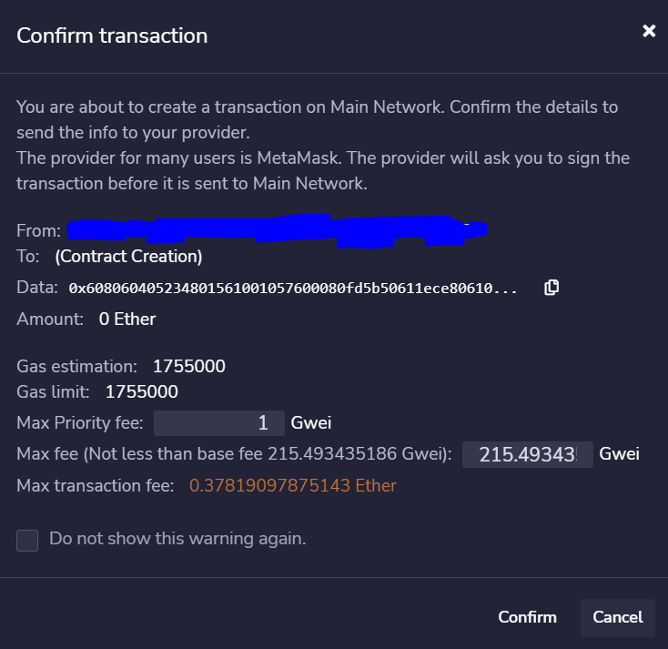 如果您有一个简单的契约,您可以将它添加到https://remix.ethereum.org/并编译它。当您点击deploy按钮时,应该会出现这样的弹出,它允许您查看气体估计、气体限制和当前的最大费用,这将使您很好地估计您的交易费用。