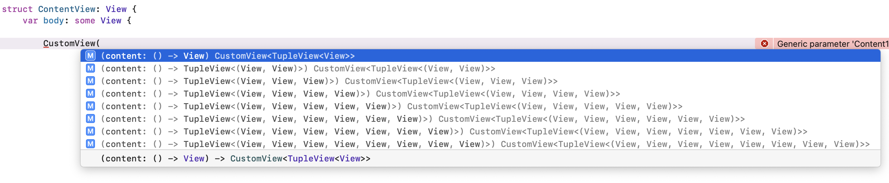 @ViewBuilder content: @escaping () -> Content) where Content == TupleView<(Content1)>对于单个视图,因为它尝试ConcreteView == TupleView<(ConcreteView)>,这是不可能的。