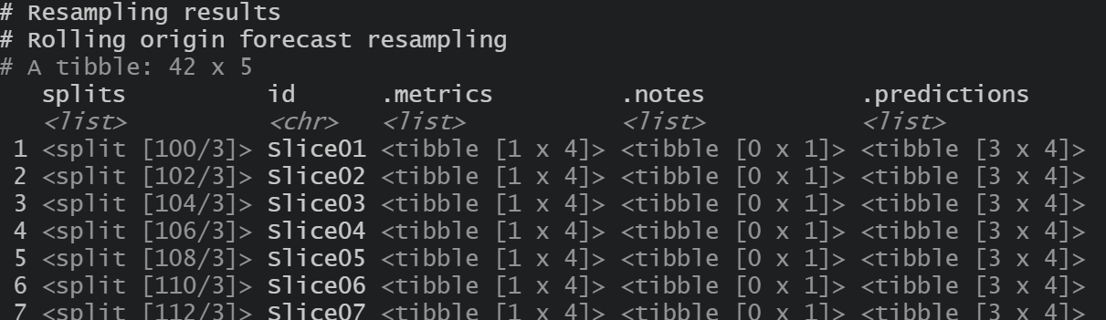 我想提取,.metrics (RMSE)从滚动起源预测重采样(tibble: 52x5)由"id“列,其中包括切片。