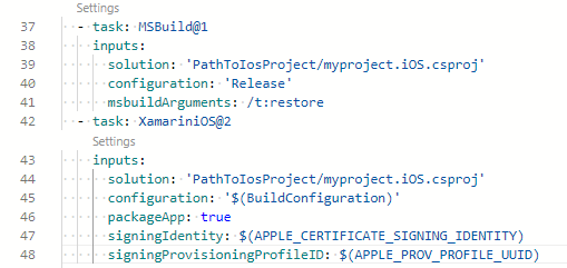 -任务: XamariniOS@2输入: solutionFile: PathToIosProject/myproject.iOS.csproj‘配置:'$(BuildConfiguration)’packageApp: true signingIdentity:$(APPLE_CERTIFICATE_SIGNING_IDENTITY)