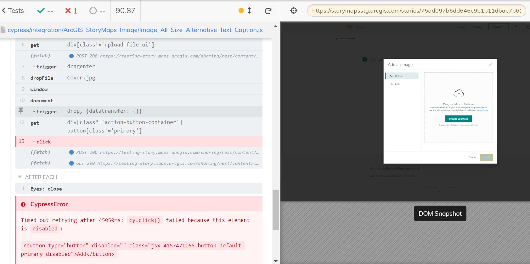 我尝试过各种方法让Cypress使用attachFile()来拖放或附加图像或视频文件。正如您在附加的Cypress故障图像上可能看到的那样,它不会将图像加载到Modal框中,add按钮仍然是禁用的,测试失败。