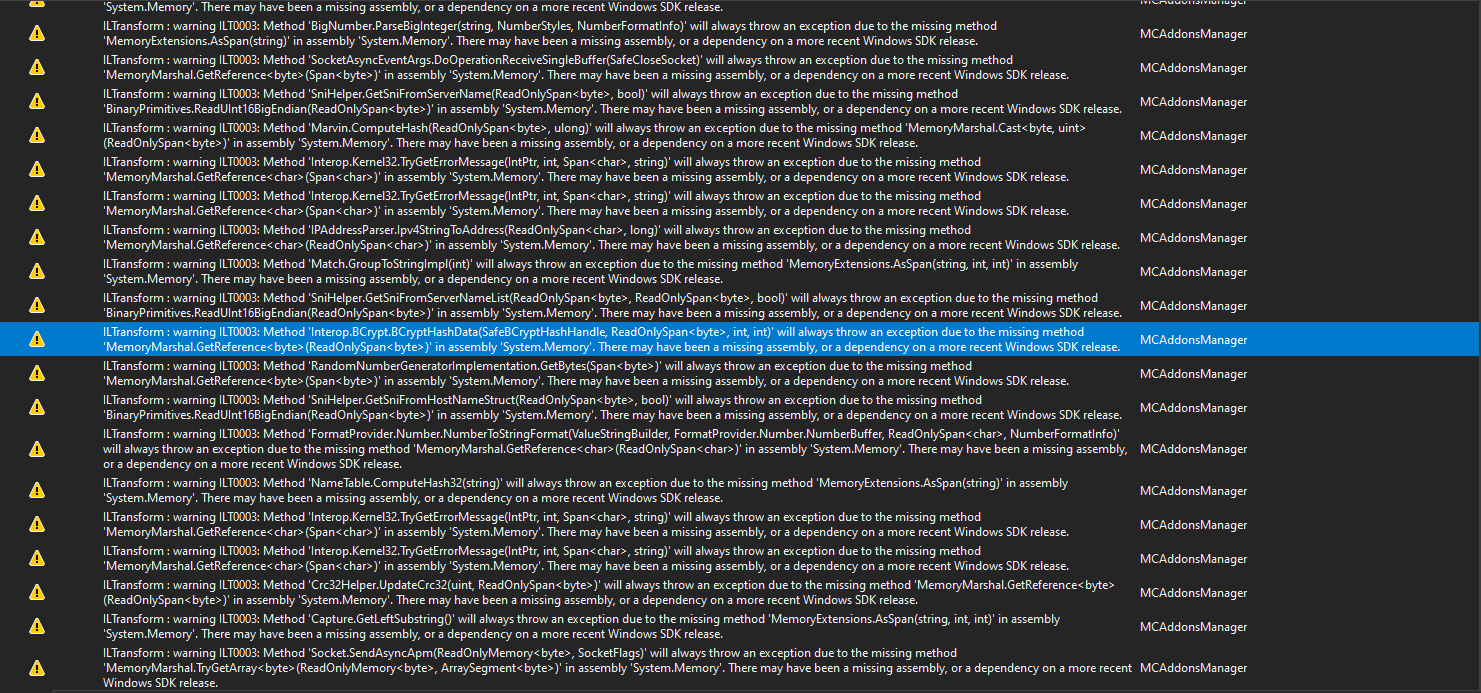 该项目编译成功,但我收到了许多关于程序集'System.Memory‘中缺少方法的警告。