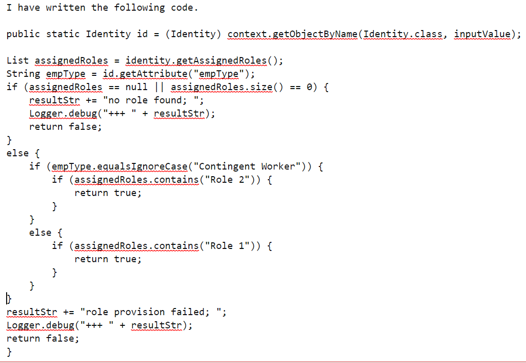 我正在尝试编写一个SailPoint IIQ工作流,如果用户是雇员,并且角色1被分配,循环将返回true。另外,如果用户是临时工作人员,并且分配了角色2,则循环将返回true。否则,循环将返回“未提供的角色”。用户是雇员,并被分配角色1,但循环仍然返回“未提供的角色”。