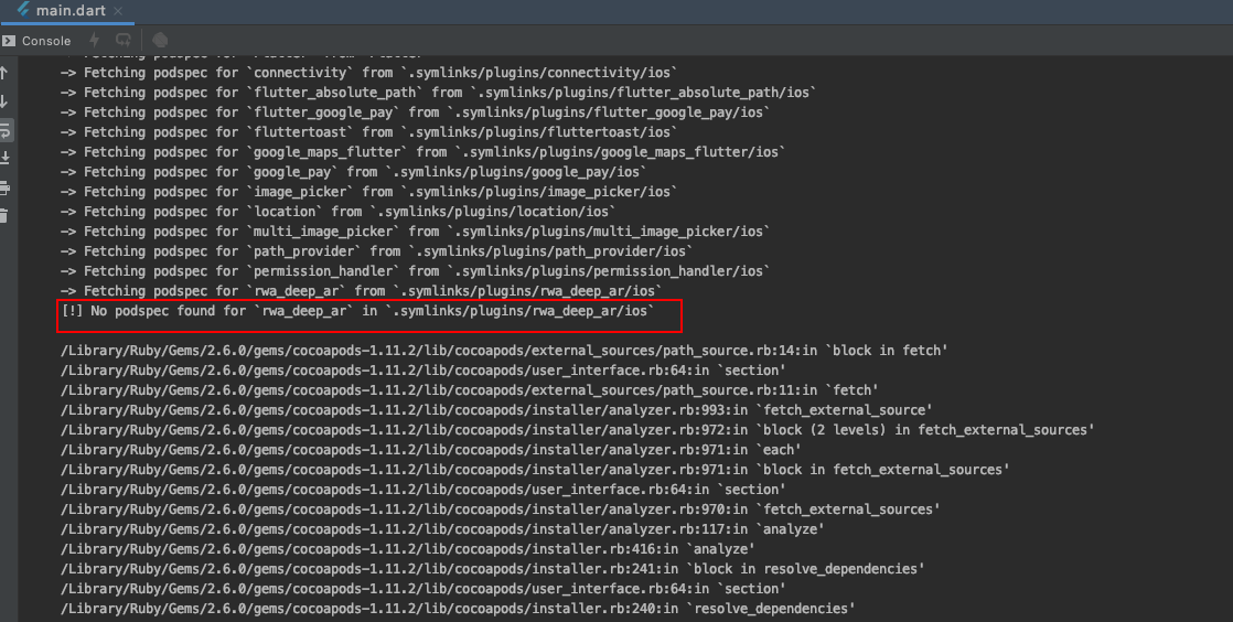 请转到您的iOS文件夹并检查rwa_deep_ar.podspec是否存在于.symlinks/plugins/rwa_deep_ar/ios中。Afaik,此包基于camera_deep_ar,作者忘记将iOS部件迁移到新名称。