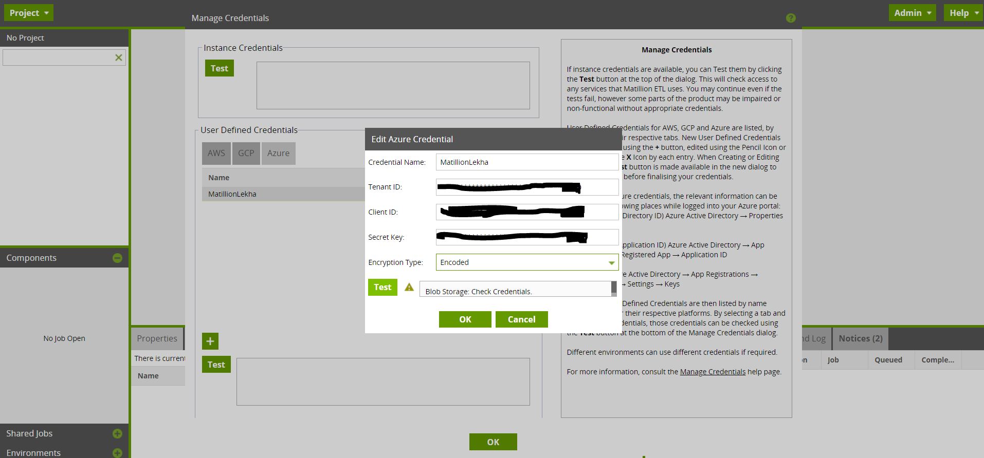 我试着创建新的项目,并选择Azure。然后,在Azure,我创建了新的应用程序注册,并从那里获取客户ID和密钥。但是,当我在Matillion中输入所有这些信息时,它会显示- Blob存储:检查凭据。