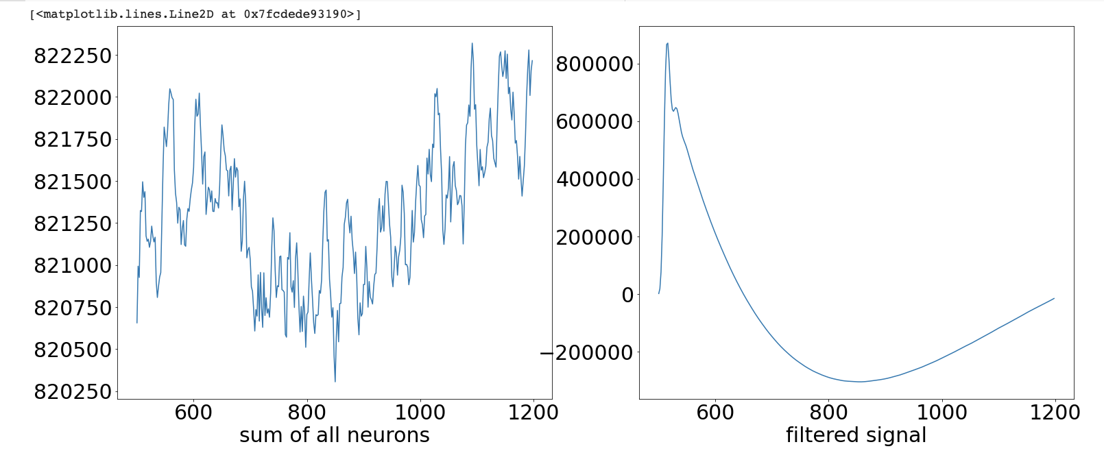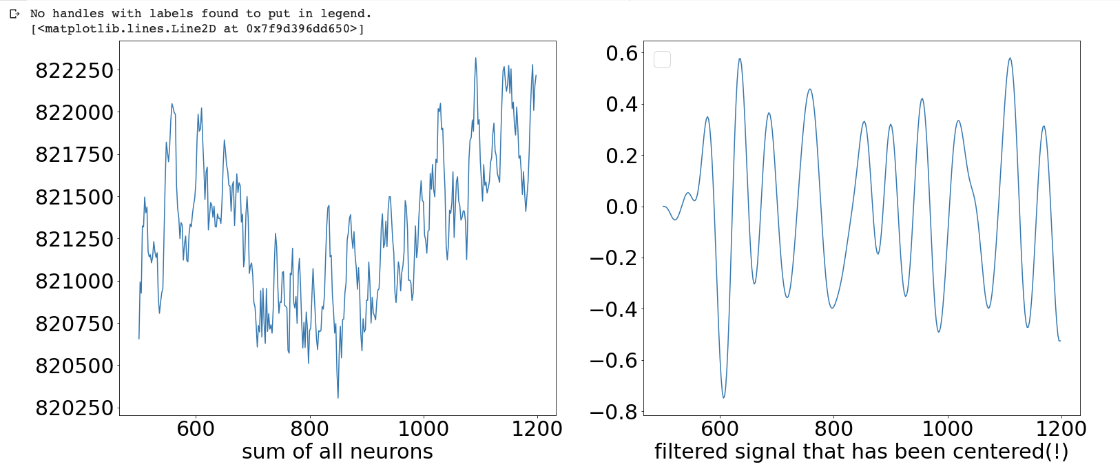 从我的数据来看,我们大约有两个正弦波,周期为700毫秒,再加上11个高频waves...should,我能看到这一点,并将低切设置为2,并将高切设置为大于11的某个值?我试过在这点上迭代几十个值.