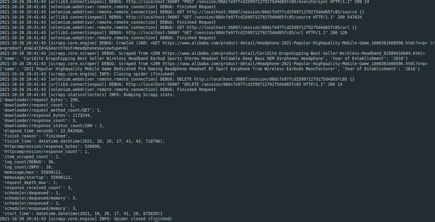 请参见下面使用刮硒库实现。Selenium对于for抓取来说非常慢。最好使用替代方法,如scrapy-splash或scrapy-playwright。只刮两页,就花了22秒钟,而剧作家只花了不到5秒。