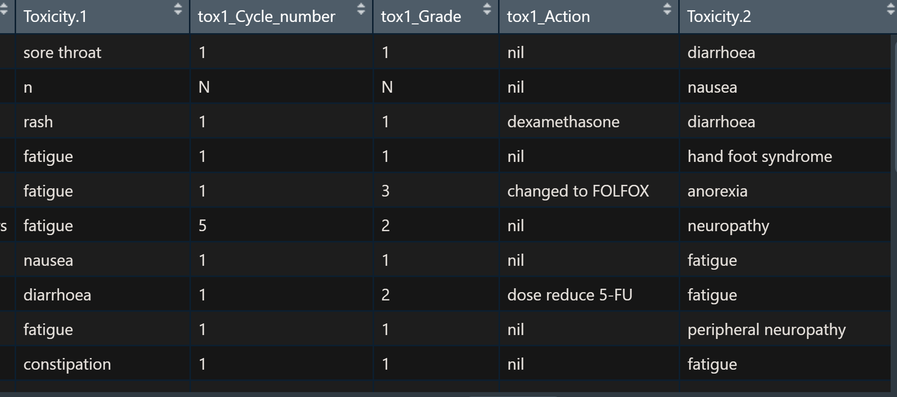 10: 10 rash ulcer nausia <NA> <NA> tox3 tox1 tox2NA值表示在该行中找不到毒性类型。否则,fatigue等下的值指示它来自哪个毒性柱。
