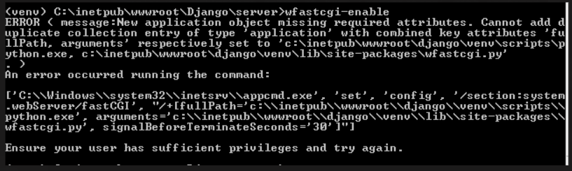 当系统管理员在windows start上写入"cmd“时,尝试在命令提示符中运行wfastcgi enable.exe,然后右击并以管理员身份运行命令提示符。然后转到python环境安装快速the的目录。然后运行wfastcgi enable.exe命令,这就是我使其工作的方式。