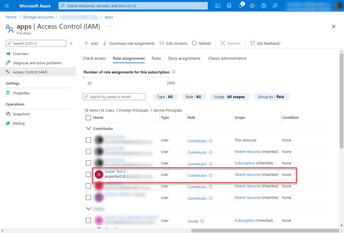 正如注释和此Microsoft文档中所提到的,您需要根据您的要求,为来自以下角色之一的文件共享提供在办公场所和Azure中都存在的用户: