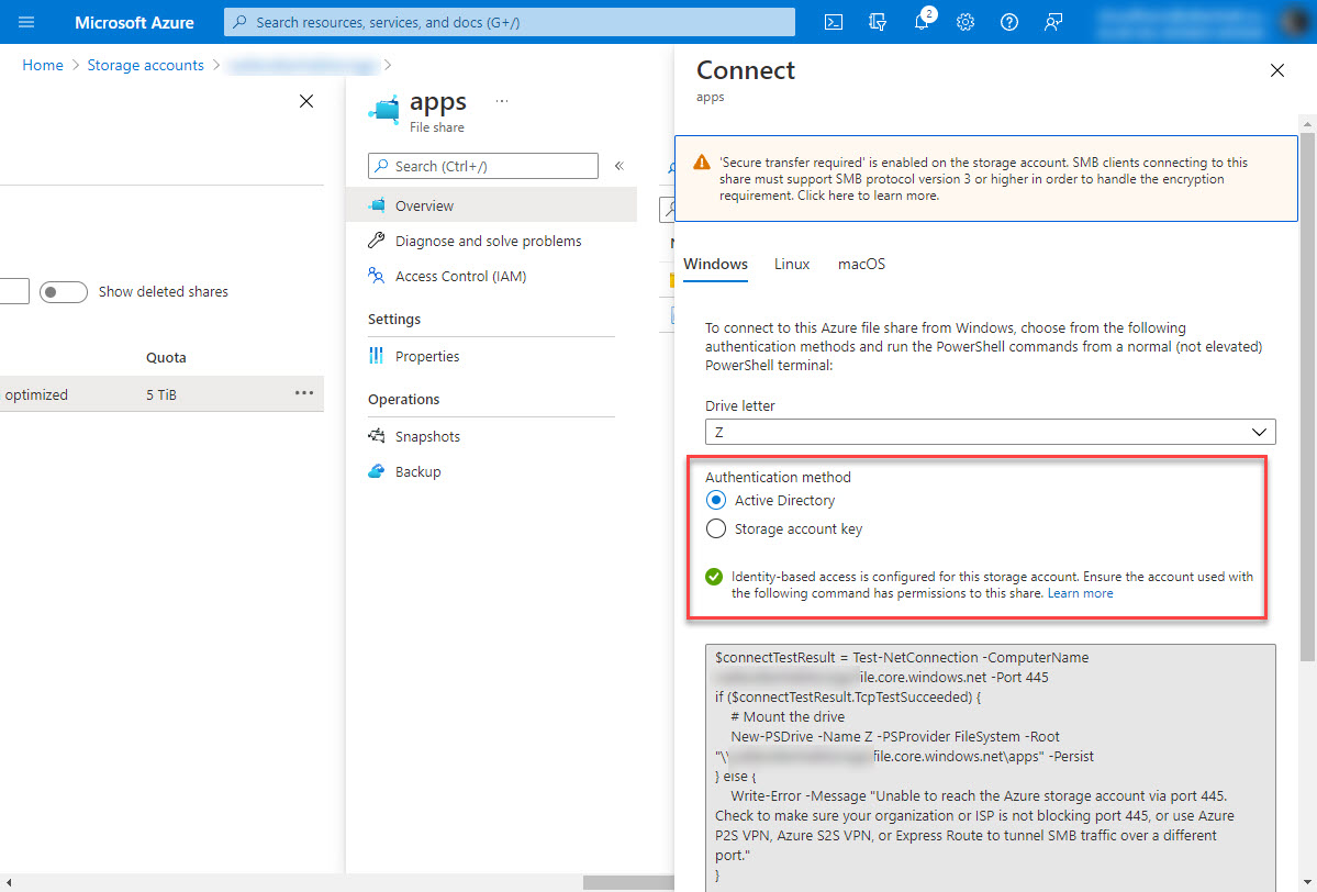 我已经创建了一个公共Azure文件共享,并将身份验证方法设置为Active。Azure存储帐户是域连接到我的店内域服务。我按照以下步骤配置它( https://learn.microsoft.com/en-gb/azure/storage/files/storage-files-identity-auth-active-directory-enable#overview )