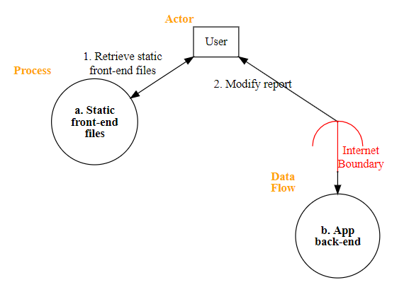 a [shape=circle label=<<FONT><B>a. Static<BR/>front-end<BR/>files</B></FONT>> xlabel=<<FONT COLOR="ORANGE"><B>Process</B></FONT>>]