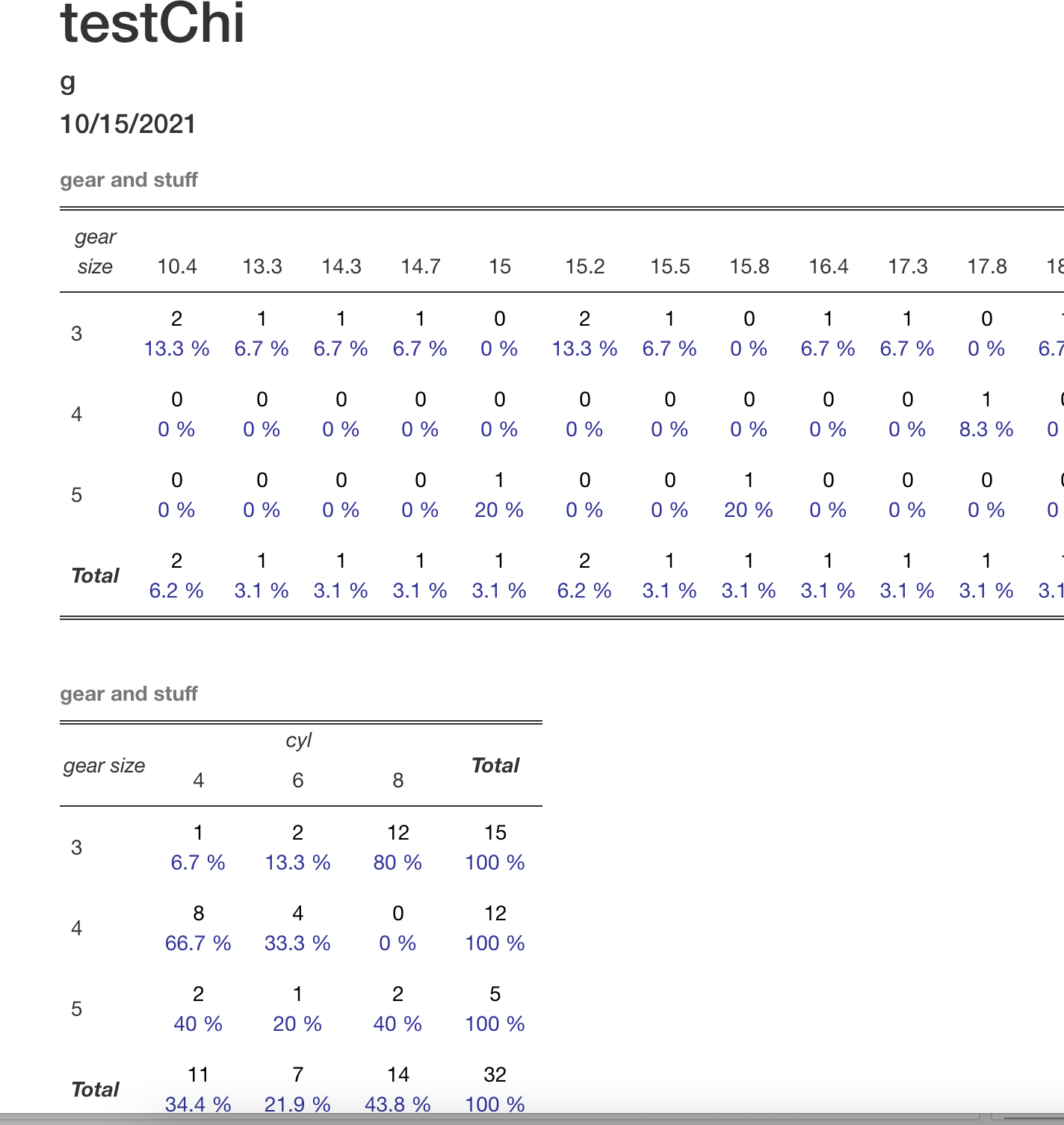 plt <- sjPlot::tab_xtab( var.row = dat$gear, var.col = dat[[x]], show.row.prc = TRUE, var.labels = c("gear size", x), title = title_name) c <- paste(c, plt$knitr)}