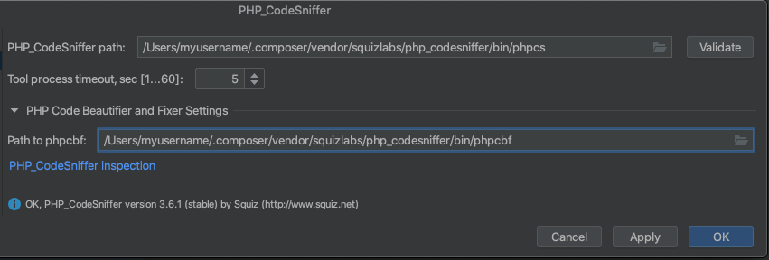 Using config file: /Users/myusername/.composer/vendor/squizlabs/php_codesniffer/CodeSniffer.conf