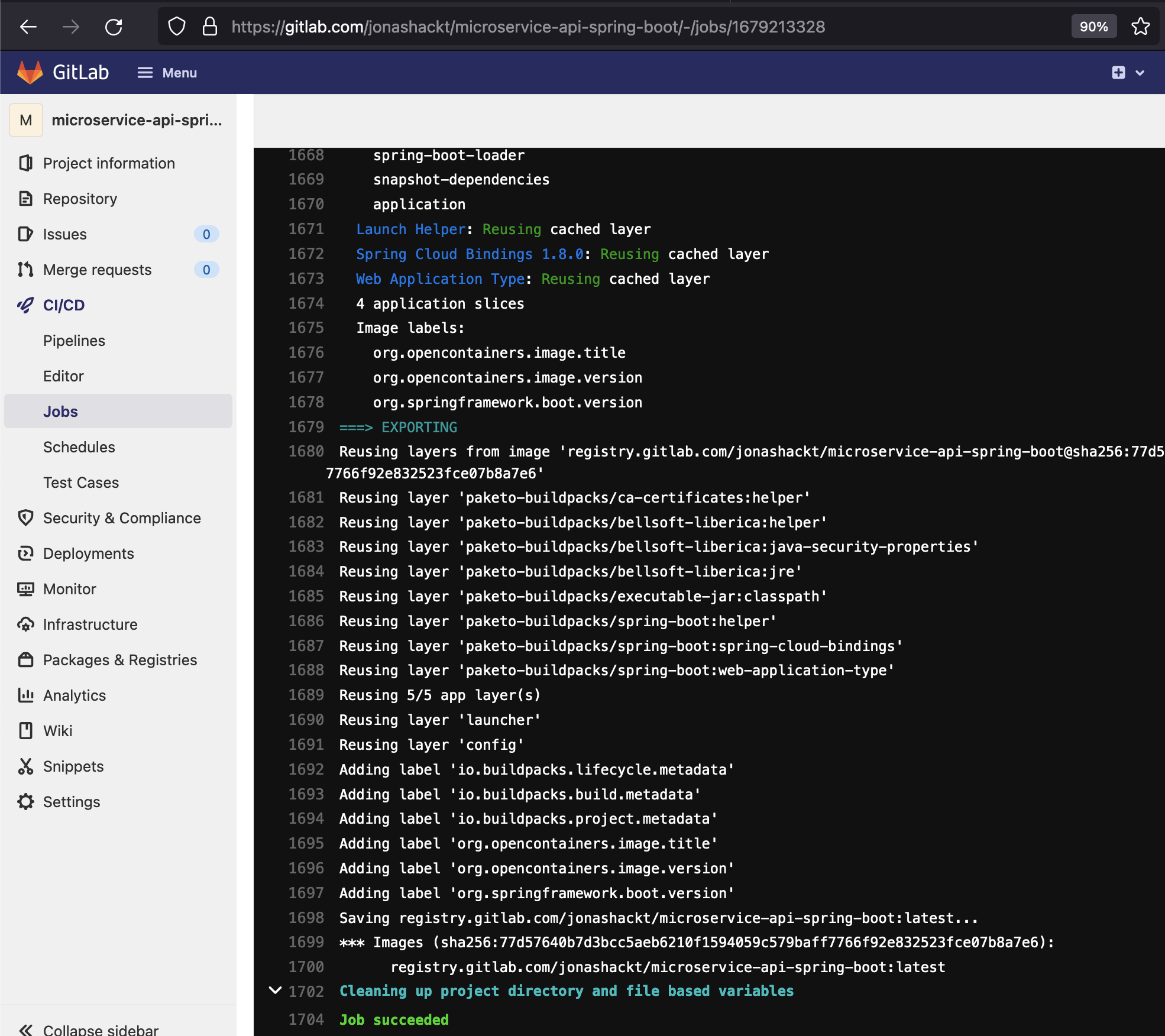 - /cnb/lifecycle/creator -app=. $CI_REGISTRY_IMAGE:latest现在,我们的构建应该使用Paketo/Buildpack成功运行,而不需要pack和Docker: