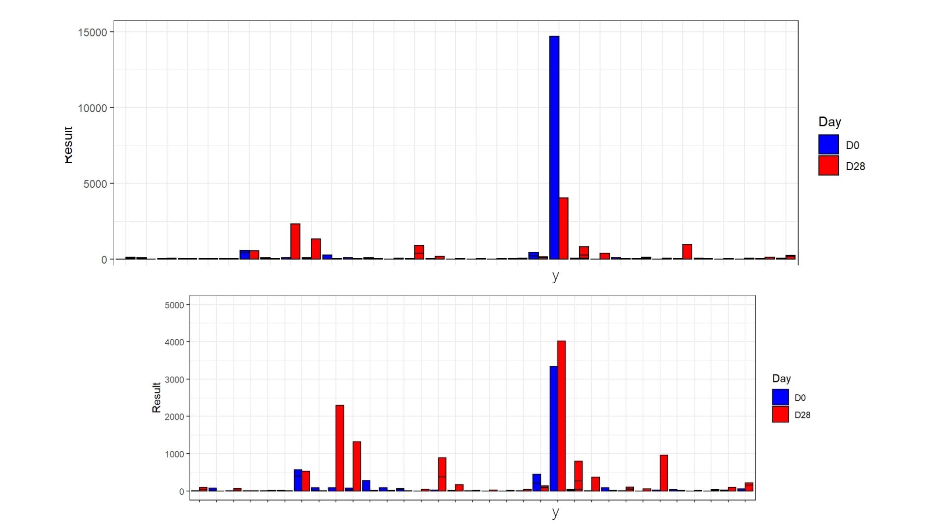 我对我的分组条形图有一个问题,我想要可视化基因的表达,因为一些基因有很高的表达,所以我决定把ylim转换成不同的值,以便更好地可视化低值。然而,这些情节看起来是这样的,在第二张图片中,标有'y‘的条子被切断,在第二张图片中,限制设置为5000。有什么想法可以解释这是为什么,以及如何解决它?我使用了这段代码grouped_bars <-ggplot(data, aes(x=gene_name, y=Result, fill=Day))+geom_bar(stat="identity",colour="black", position="dodge")+ scale_fill_manual(values =c("blue","red")) + ylim(0, 5000)