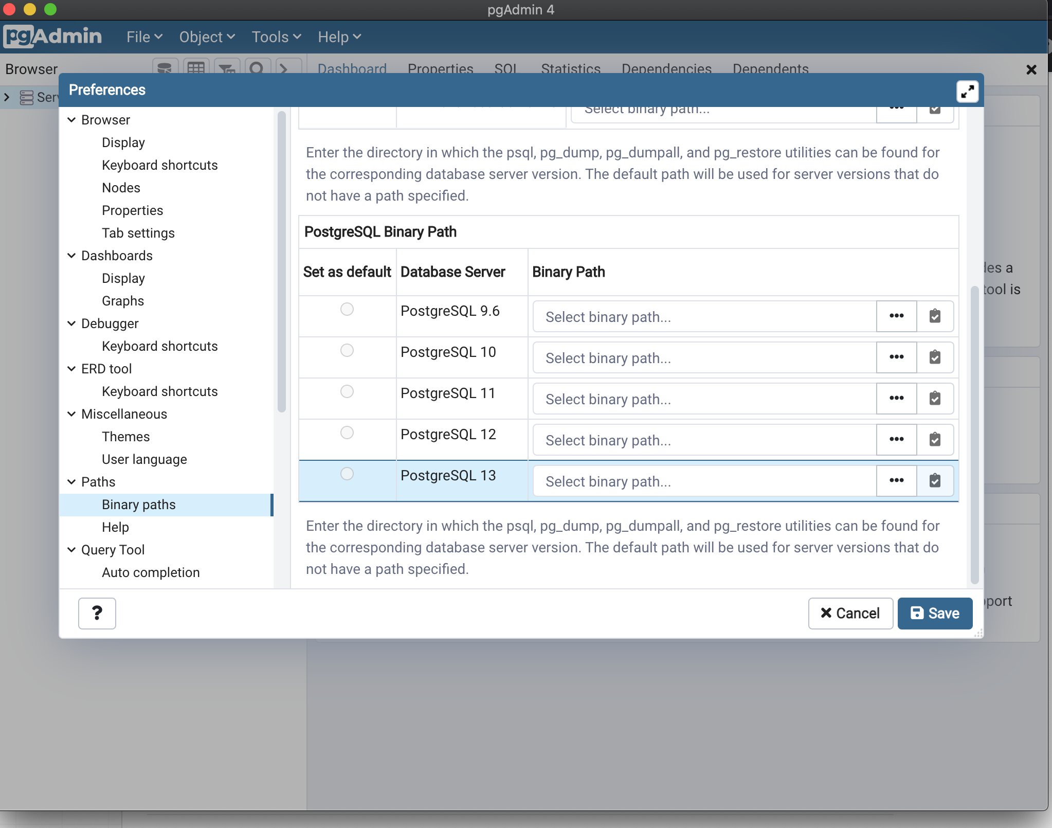 我正在阅读本教程: PostgreSQL:https://dba.stackexchange.com/questions/149169/binary-path-in-the-pgadmin-preferences
