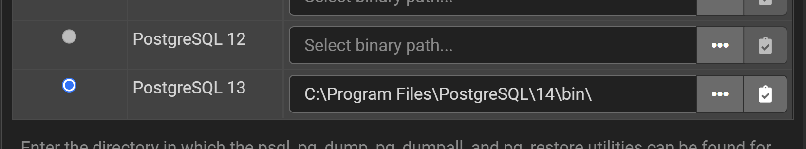 看一下最初的屏幕截图,它看起来就像一个Mac界面。因此,如果您在Mac上,可以将PostgreSQL 13设置为默认值,并使用路径/Library/Applications/PostgreSQL/14/bin/。