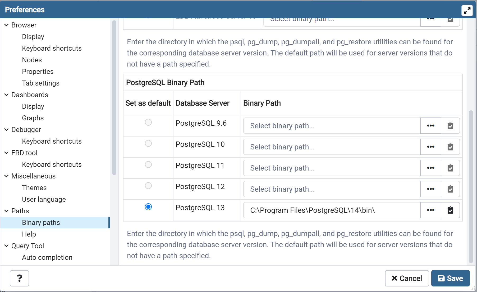 为了设置PostgreSQL二进制路径,我查看了我在PgAdmin上的首选项,我看到除了实际使用的PostgreSQL 14之外,所有版本的PostgreSQL都要更新二进制路径。