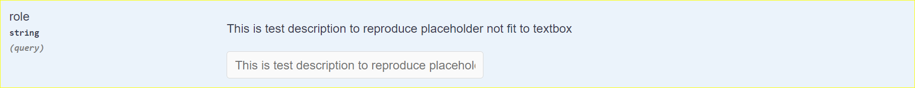 }]当我将openapi.json加载到swagger时,它会显示描述以及文本框占位符。是否有任何方法为占位符添加单独的文本或修复占位符中的所有文本?这里的文字被剥夺了